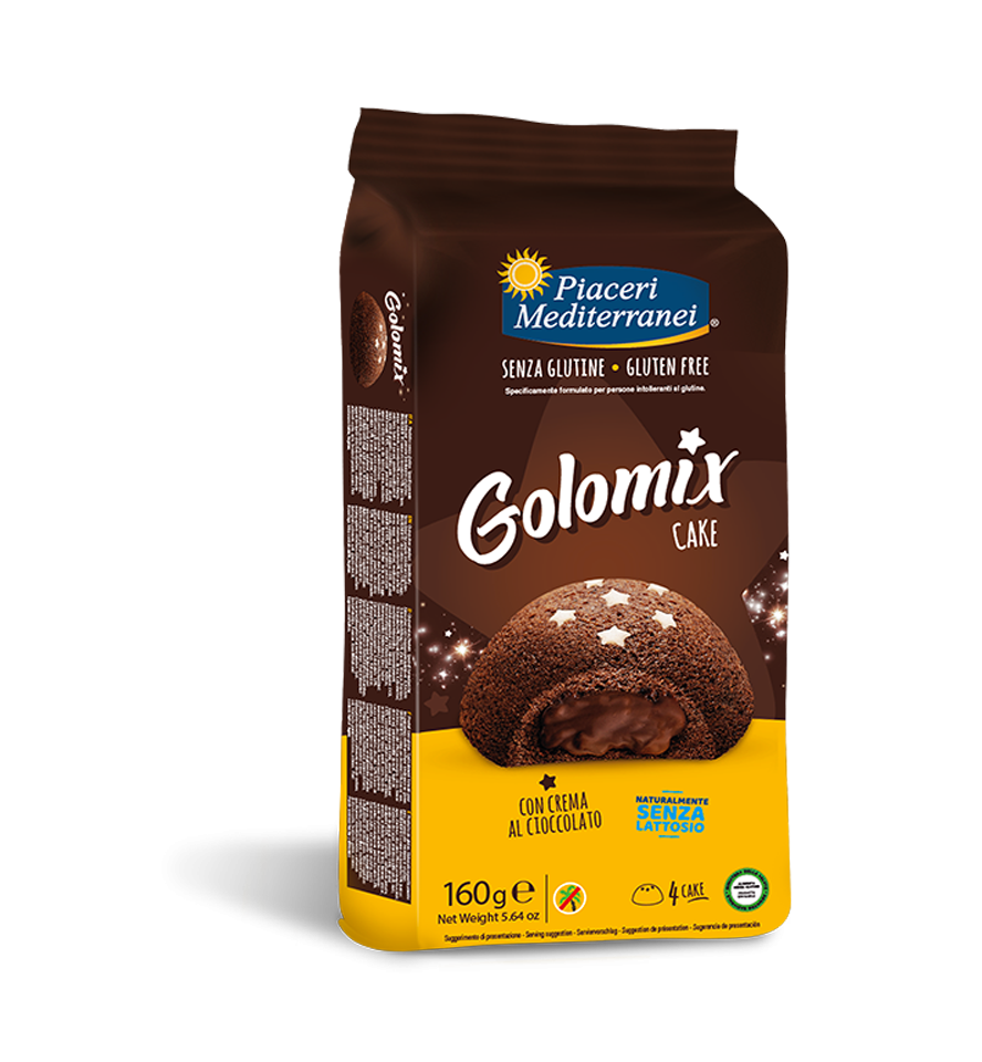 Soffice merendina al cacao ripiena di crema al cioccolato e con stelline di zucchero in superficie. Golomix Cake senza glutine è sinonimo di bontà unica